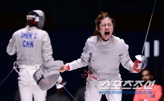 23일 오후 경기도 고양시 고양체유관에서 2014 인천 아시안게임 펜싱 여자 사브르 단체전이 열렸다. 한국의 마지막 주자인 김지연이 중국에 승리하며 금메달을 획득하자 환호하고 있다.
