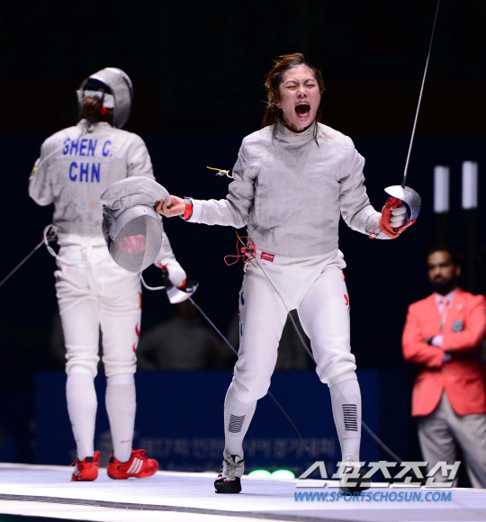 23일 오후 경기도 고양시 고양체유관에서 2014 인천 아시안게임 펜싱 여자 사브르 단체전이 열렸다. 한국의 마지막 주자인 김지연이 중국에 승리하며 금메달을 획득하자 환호하고 있다.