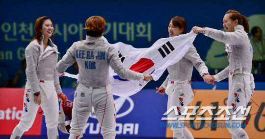 23일 오후 경기도 고양시 고양체유관에서 2014 인천 아시안게임 펜싱 여자 사브르 단체전이 열렸다. 45대 41로 중국에 승리하며 단체전 금메달을 획득한 한국 선수들이 태극기를 흔들며 기뻐하고 있다.