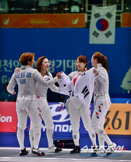 23일 오후 경기도 고양시 고양체유관에서 2014 인천 아시안게임 펜싱 여자 사브르 단체전이 열렸다. 45대 41로 중국에 승리하며 단체전 금메달을 획득한 한국 선수들이 태극기를 흔들며 기뻐하고 있다.