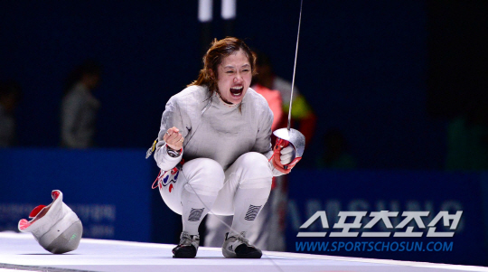 23일 오후 경기도 고양시 고양체유관에서 2014 인천 아시안게임 펜싱 여자 사브르 단체전이 열렸다. 한국의 마지막 주자로 나와 중국에 45대 41로 승리한 김지연이 금메달을 획득하자 환호하고 있다.