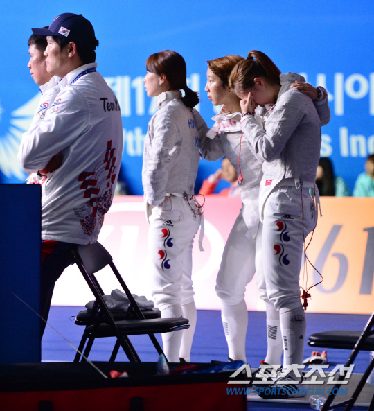23일 오후 경기도 고양시 고양체유관에서 2014 인천 아시안게임 펜싱 여자 사브르 단체전이 열렸다. 한국 벤치의 윤지수가 기도를 하고 있다.