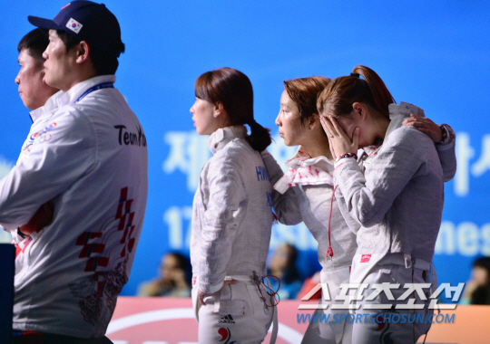 23일 오후 경기도 고양시 고양체유관에서 2014 인천 아시안게임 펜싱 여자 사브르 단체전이 열렸다. 한국 벤치의 윤지수가 기도를 하고 있다.