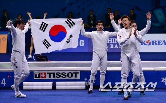 23일 오후 경기도 고양시 고양체유관에서 2014 인천 아시안게임 남자 에뻬 단체전이 열렸다. 일본에 승리하며 단체전 금메달을 획득한 한국 선수들이 태극기를 들고 환호하고 있다.