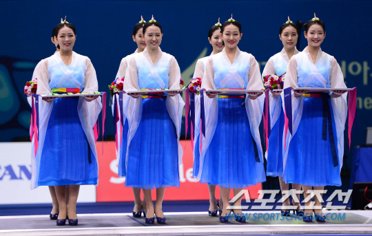 23일 오후 경기도 고양시 고양체유관에서 2014 인천 아시안게임 남자 에뻬 단체전이 열렸다. 시상식에서 도우미들이 메달을 든 채 대기하고 있다.