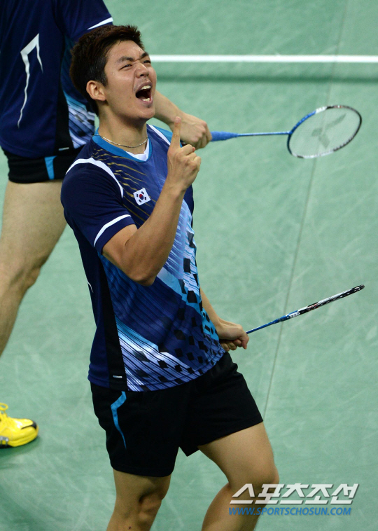 2014 인천아시안게임 배드민턴 남자 단체전 결승 23일 인천 계양체육관에서 열렸다. 2경기 1세트를 듀스끝에 따낸 이용대-유연성이 환호하고 있다.