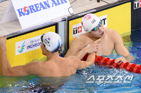 한국수영대표팀 박태환이 23일 인천 문학박태환수영장에서 열린 2014인천아시안게임 남자 400m 자유영 결승전을 마친후 중국 쑨양과 손을 맞잡고 있다.