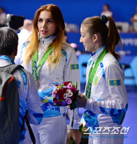 23일 오후 경기도 고양시 고양체유관에서 2014 인천 아시안게임 여자 사브르 단체전이 열렸다. 동메달을 차지한 카자흐스탄 선수들이 기념사진을 찍고 있다.