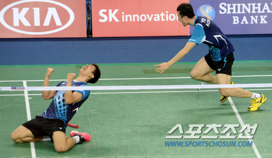 2014 인천아시안게임 배드민턴 남자 단체전 결승 23일 인천 계양체육관에서 열렸다. 2경기 이용대-유연성 조가 중국의 수 첸-장 난 조와의 경기를 승리한 후 환호하고 있다.