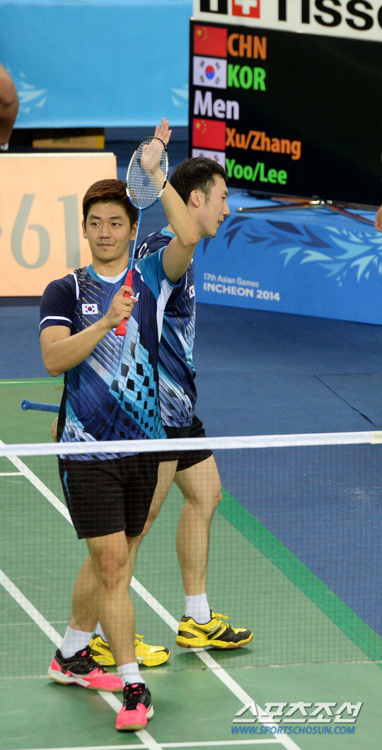 2014 인천아시안게임 배드민턴 남자 단체전 결승 23일 인천 계양체육관에서 열렸다. 2경기 이용대-유연성 조가 중국의 수 첸-장 난 조와의 경기를 승리한 후 환호하고 있다.