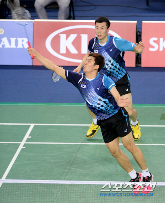 2014 인천아시안게임 배드민턴 남자 단체전 결승 23일 인천 계양체육관에서 열렸다. 2경기에서 이용대-유연성 조가 중국의 수 첸-장 난 조와의 경기를 펼쳤다. 힘차게 공격을 시도하는 이용대.