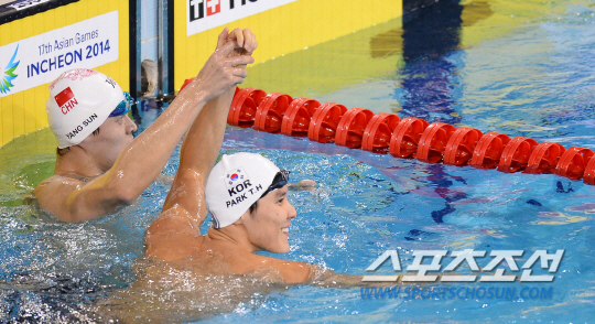 한국수영대표팀 박태환이 23일 인천 문학박태환수영장에서 열린 2014인천아시안게임 남자 400m 자유영 결승전을 마친후 중국 쑨양과 손을 맞잡고 있다.