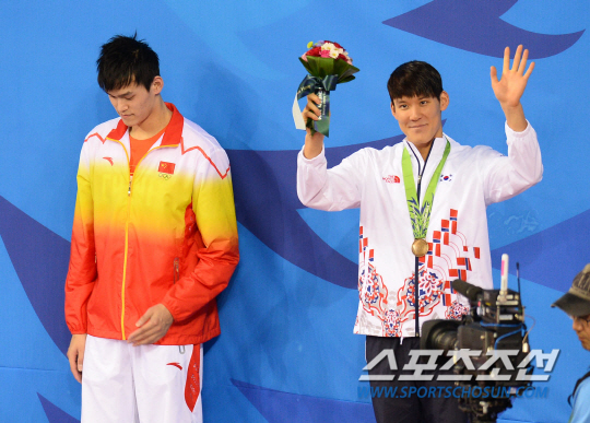 한국수영대표팀 박태환이 23일 인천 문학박태환수영장에서 열린 2014인천아시안게임 남자 400m 자유영 결선에서 동메달을 목에 건후 관중들의 성원에 답례하고 있다.