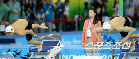 한국수영대표팀 박태환이 23일 인천 문학박태환수영장에서 열린 2014인천아시안게임 남자 400m 자유영 결승전에서 스타트 하고있다.