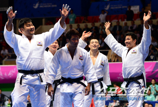 23일 인천 도원체육관 유도경기장에서 '2014인천아시아경기대회' 유도 남녀 단체전이 열렸다. 유도 단체전은 이번 아시안게임에서 처음 도입됐다. 개인전에서 금메달을 따낸 김재범과 정다운, 김성연이 단체전에 참가해 한국 유도 최초로 아시안게임 2관왕에 도전했다. 남자결승전에서 대한민국이 카자흐스탄에 4대1로 승리하며 금메달을 차지했다. 금메달이 확정되자 환호하고 있는 선수들.