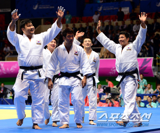 23일 인천 도원체육관 유도경기장에서 '2014인천아시아경기대회' 유도 남녀 단체전이 열렸다. 유도 단체전은 이번 아시안게임에서 처음 도입됐다. 개인전에서 금메달을 따낸 김재범과 정다운, 김성연이 단체전에 참가해 한국 유도 최초로 아시안게임 2관왕에 도전했다. 남자결승전에서 대한민국이 카자흐스탄에 4대1로 승리하며 금메달을 차지했다. 금메달이 확정되자 환호하고 있는 선수들.