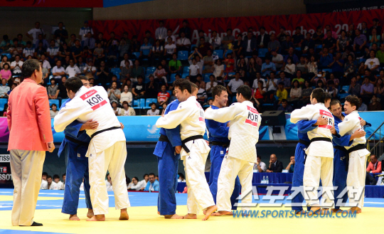 23일 인천 도원체육관 유도경기장에서 '2014인천아시아경기대회' 유도 남녀 단체전이 열렸다. 유도 단체전은 이번 아시안게임에서 처음 도입됐다. 개인전에서 금메달을 따낸 김재범과 정다운, 김성연이 단체전에 참가해 한국 유도 최초로 아시안게임 2관왕에 도전했다. 남자결승전에서 대한민국이 카자흐스탄에 4대1로 승리하며 금메달을 차지했다. 금메달을 확정하고 카자흐스탄 선수들과 악수를 나누고 있는 선수들.