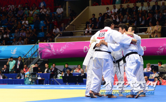 23일 인천 도원체육관 유도경기장에서 '2014인천아시아경기대회' 유도 남녀 단체전이 열렸다. 유도 단체전은 이번 아시안게임에서 처음 도입됐다. 개인전에서 금메달을 따낸 김재범과 정다운, 김성연이 단체전에 참가해 한국 유도 최초로 아시안게임 2관왕에 도전했다. 남자결승전에서 대한민국이 카자흐스탄에 4대1로 승리하며 금메달을 차지했다. 금메달이 확정되자 환호하고 있는 선수들.