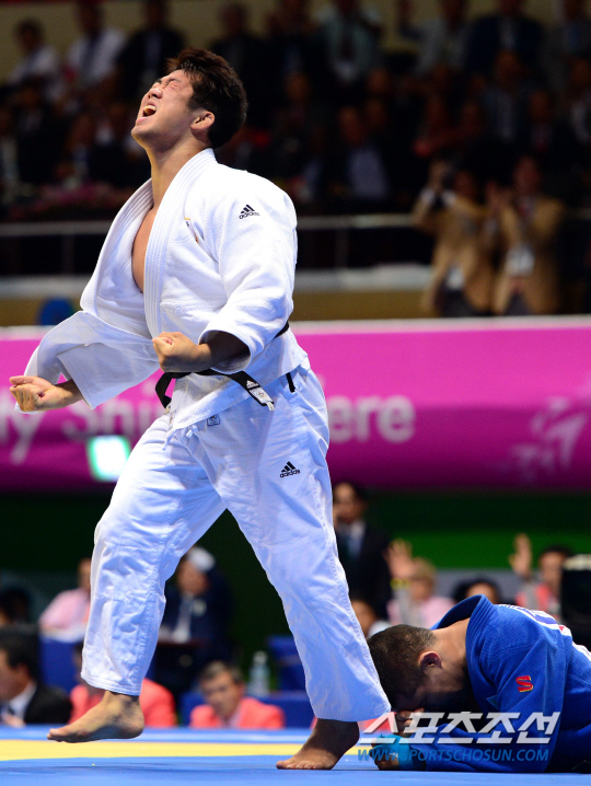 23일 인천 도원체육관 유도경기장에서 '2014인천아시아경기대회' 유도 남녀 단체전이 열렸다. 유도 단체전은 이번 아시안게임에서 처음 도입됐다. 개인전에서 금메달을 따낸 김재범과 정다운, 김성연이 단체전에 참가해 한국 유도 최초로 아시안게임 2관왕에 도전했다. 남자결승전에서 대한민국이 카자흐스탄에 4대1로 승리하며 금메달을 차지했다. 이규원이 승리가 확정되자 포효하고 있다.