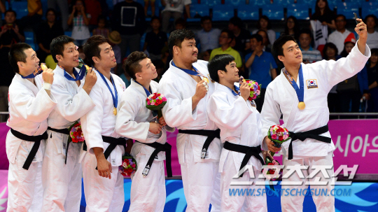 23일 인천 도원체육관 유도경기장에서 '2014인천아시아경기대회' 유도 남녀 단체전이 열렸다. 유도 단체전은 이번 아시안게임에서 처음 도입됐다. 개인전에서 금메달을 따낸 김재범과 정다운, 김성연이 단체전에 참가해 한국 유도 최초로 아시안게임 2관왕에 도전했다. 남자결승전에서 대한민국이 카자흐스탄에 4대1로 승리하며 금메달을 차지했다. 시상식을 마치고 기념 셀카를 찍고 있는 선수들.