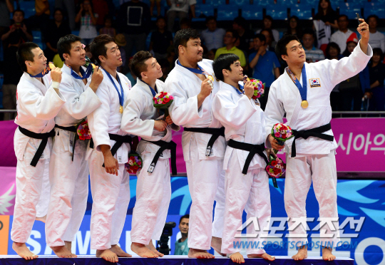 23일 인천 도원체육관 유도경기장에서 '2014인천아시아경기대회' 유도 남녀 단체전이 열렸다. 유도 단체전은 이번 아시안게임에서 처음 도입됐다. 개인전에서 금메달을 따낸 김재범과 정다운, 김성연이 단체전에 참가해 한국 유도 최초로 아시안게임 2관왕에 도전했다. 남자결승전에서 대한민국이 카자흐스탄에 4대1로 승리하며 금메달을 차지했다. 시상식을 마치고 기념 셀카를 찍고 있는 선수들.