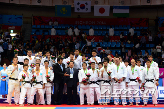 23일 인천 도원체육관 유도경기장에서 '2014인천아시아경기대회' 유도 남녀 단체전이 열렸다. 유도 단체전은 이번 아시안게임에서 처음 도입됐다. 개인전에서 금메달을 따낸 김재범과 정다운, 김성연이 단체전에 참가해 한국 유도 최초로 아시안게임 2관왕에 도전했다. 남자결승전에서 대한민국이 카자흐스탄에 4대1로 승리하며 금메달을 차지했다. 시상식을 마치고 모든 선수들이 기념 포즈를 취하고 있다.