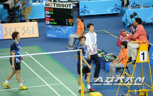 2014 인천아시안게임 배드민턴 남자 단체전 결승 23일 인천 계양체육관에서 열렸다. 4경기에서 김기정-김사랑 조가 중국의 자이 윈-푸하이 펑 조와 경기를 펼쳤다. 3세트 중국의 득점때 김사랑이 중국 선수의 몸에 맞았다며 어필을 했으나 받아들여지지 않고 있다.