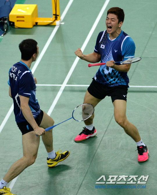 세계랭킹 1위 이용대(삼성전기)-유용성(국군체육부대)조는 두번째 복식 경기에서 분위기를 그대로 이어갔다. 슈젠-장난조를 2-0(23-21 21-13)으로 가볍게 제압했다. 49분 걸렸다. 올초 도핑 기피 논란으로 국제배드민턴연맹(IBF)로부터 선수 자격 1년 정지까지 갔다가 명예회복한 이용대는 몸을 던져서 떨어지는 셔틀콕을 받아내는 묘기를 연출했다. 자신의 아시안게임 첫 금메달을 위한 강한 의지를 보였다. 유용성 역시 이용대와 멋진 호흡으로 위기를 넘기면 자기 몫을 다했다. 한국은 게임 스코어 2-0으로 리드, 중국을 벼랑 끝으로 몰아갔다.