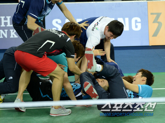 남자 배드민턴이 12년 만에 아시안게임 단체전 금메달을 되찾았다. 2014 인천아시안게임 배드민턴 남자 단체전 결승 23일 인천 계양체육관에서 열렸다. 마지막 5경기 이현일이 승리를 거두며 금메달이 확정되자 선수들이 달려나오며 환호하고 있다.