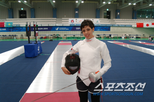인천아시안게임의 영문 슬로건은 'Diversity Shines Here(다양성이 여기서 빛난다)'다. 22일 경기도 고양실내체육관에서 펼쳐진 인천아시안게임 펜싱 여자에페 예선뿔 스타트리스트에 낯선 이름이 등장했다. 예선 A조에 속한 '팔레스타인 펜서' 하닌 알자메르였다.
