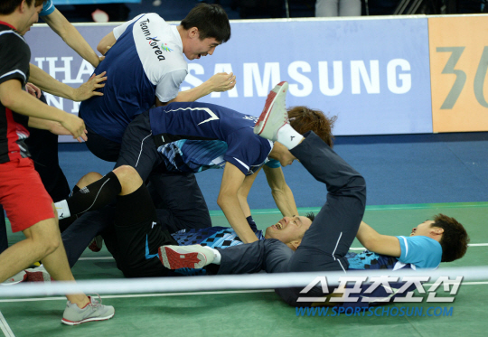남자 배드민턴이 12년 만에 아시안게임 단체전 금메달을 되찾았다. 2014 인천아시안게임 배드민턴 남자 단체전 결승 23일 인천 계양체육관에서 열렸다. 마지막 5경기 이현일이 승리를 거두며 금메달이 확정되자 선수들이 달려나오며 환호하고 있다.