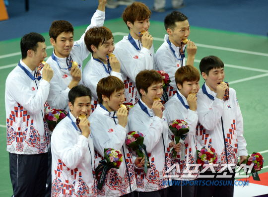 남자 배드민턴이 12년 만에 아시안게임 단체전 금메달을 되찾았다. 2014 인천아시안게임 배드민턴 남자 단체전 결승 23일 인천 계양체육관에서 열렸다. 이어 진행된 시상식에서 선수들이 시상대에 올라 포즈를 취하고 있다.