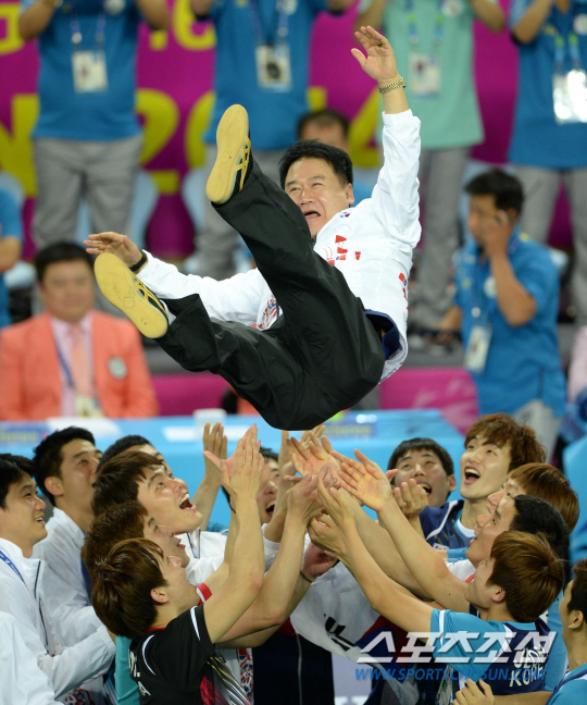 남자 배드민턴이 12년 만에 아시안게임 단체전 금메달을 되찾았다. 2014 인천아시안게임 배드민턴 남자 단체전 결승 23일 인천 계양체육관에서 열렸다. 마지막 5경기 이현일이 승리를 거두며 금메달이 확정되자 선수들이 이득춘 감독을 행가레하고 있다.