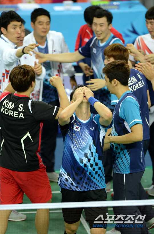 남자 배드민턴이 12년 만에 아시안게임 단체전 금메달을 되찾았다. 2014 인천아시안게임 배드민턴 남자 단체전 결승 23일 인천 계양체육관에서 열렸다. 마지막 5경기 이현일이 승리를 거두며 금메달이 확정되자 선수들이 달려나오며 환호하고 있다.