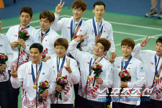 남자 배드민턴이 12년 만에 아시안게임 단체전 금메달을 되찾았다. 2014 인천아시안게임 배드민턴 남자 단체전 결승 23일 인천 계양체육관에서 열렸다. 이어 진행된 시상식에서 선수들이 시상대에 올라 포즈를 취하고 있다.