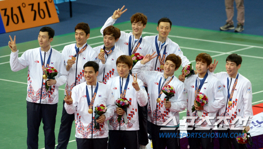 남자 배드민턴이 12년 만에 아시안게임 단체전 금메달을 되찾았다. 2014 인천아시안게임 배드민턴 남자 단체전 결승 23일 인천 계양체육관에서 열렸다. 이어 진행된 시상식에서 선수들이 시상대에 올라 포즈를 취하고 있다.