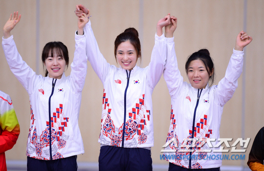 24일 오전 인천 옥련국제사격장에서 2014 인천 아시안게임 여자 사격 50M 소총 복사 단체전 시상식이 열렸다. 금메달을 차지한 한국 선수들이 환호하고 있다.