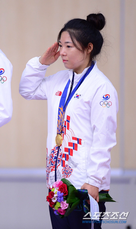 24일 오전 인천 옥련국제사격장에서 2014 인천 아시안게임 여자 사격 50M 소총 복사 단체전 시상식이 열렸다. 금메달을 차지한 한국 음빛나가 국기에 대한 경례를 하고 있다.