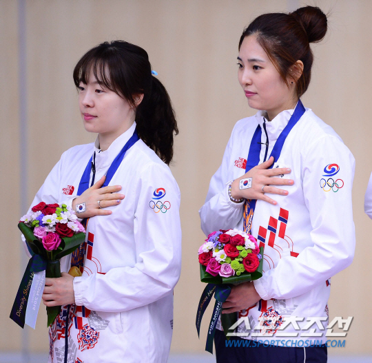 24일 오전 인천 옥련국제사격장에서 2014 인천 아시안게임 여자 사격 50M 소총 복사 단체전 시상식이 열렸다. 금메달을 차지한 한국 나윤경(왼쪽)과 정미라가 국기에대한 경례를 하고 있다.
