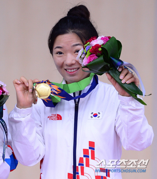 24일 오전 인천 옥련국제사격장에서 2014 인천 아시안게임 여자 사격 50M 소총 복사 단체전 시상식이 열렸다. 단체전 금메달과 개인전 동메달을 차지한 한국 음빛나가 환하게 웃고 있다.
