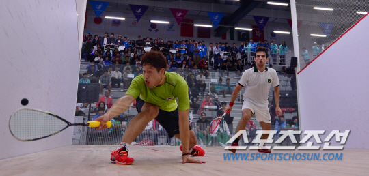 24일 오전 인천 열우물 스쿼시장에서 2014 인천 아시안게임 남자 스쿼시 단체 예선전 한국과 파키스탄의 경기가 열렸다. 한국 황중원과 파키스탄 다니스가 경기를 벌이고 있다.