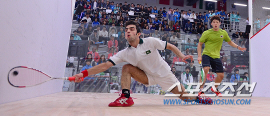 24일 오전 인천 열우물 스쿼시장에서 2014 인천 아시안게임 남자 스쿼시 단체 예선전 한국과 파키스탄의 경기가 열렸다. 한국 황중원과 파키스탄 다니스가 경기를 벌이고 있다.