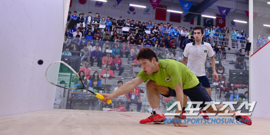 24일 오전 인천 열우물 스쿼시장에서 2014 인천 아시안게임 남자 스쿼시 단체 예선전 한국과 파키스탄의 경기가 열렸다. 한국 황중원과 파키스탄 다니스가 경기를 벌이고 있다.