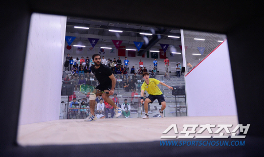 24일 오전 인천 열우물 스쿼시장에서 2014 인천 아시안게임 남자 스쿼시 단체 예선전 한국과 파키스탄의 경기가 열렸다. 한국 유재진과 파키스탄 메밥이 경기를 벌이고 있다.