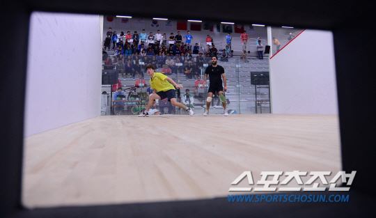 24일 오전 인천 열우물 스쿼시장에서 2014 인천 아시안게임 남자 스쿼시 단체 예선전 한국과 파키스탄의 경기가 열렸다. 한국 유재진과 파키스탄 메밥이 경기를 벌이고 있다.