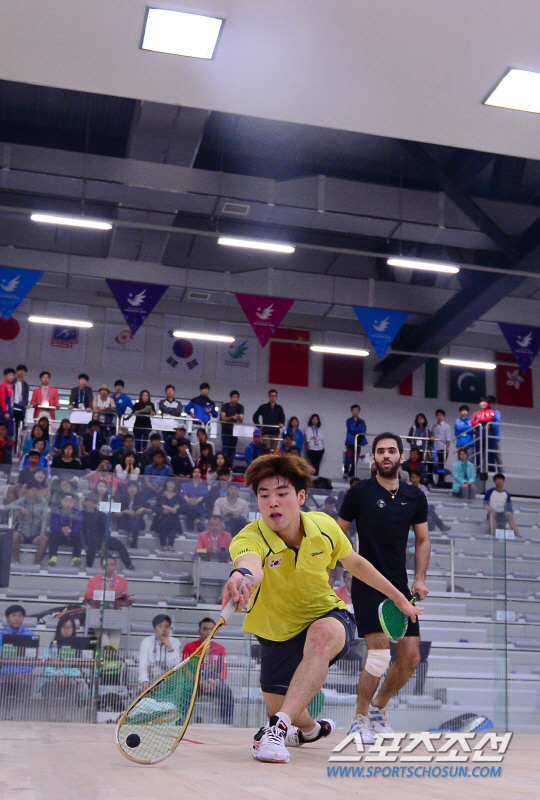 24일 오전 인천 열우물 스쿼시장에서 2014 인천 아시안게임 남자 스쿼시 단체 예선전 한국과 파키스탄의 경기가 열렸다. 한국 유재진과 파키스탄 메밥이 경기를 벌이고 있다.