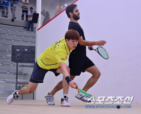 24일 오전 인천 열우물 스쿼시장에서 2014 인천 아시안게임 남자 스쿼시 단체 예선전 한국과 파키스탄의 경기가 열렸다. 한국 유재진과 파키스탄 메밥이 경기를 벌이고 있다.