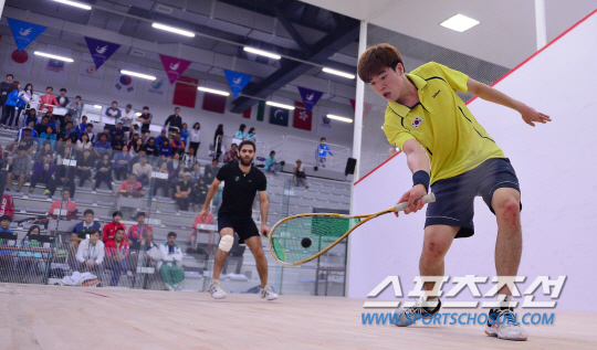 24일 오전 인천 열우물 스쿼시장에서 2014 인천 아시안게임 남자 스쿼시 단체 예선전 한국과 파키스탄의 경기가 열렸다. 한국 유재진과 파키스탄 메밥이 경기를 벌이고 있다.