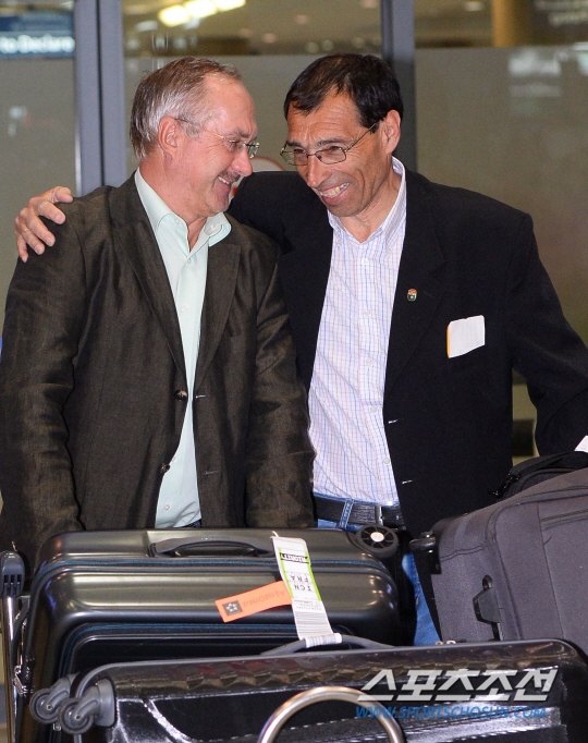 한국국가대표 축구대표팀 울리에 슈틸리케 감독이 카를로스 아르모아 수석코치와 함께 24일 인천공항을 통해 입국하고 있다. 슈틸리케 감독은 지난 8일 한국에 와 취임기자회견 후 한국-우루과이 평가전을 관전하고 신변정리를 위해 11일 마드리드로 떠났었다.