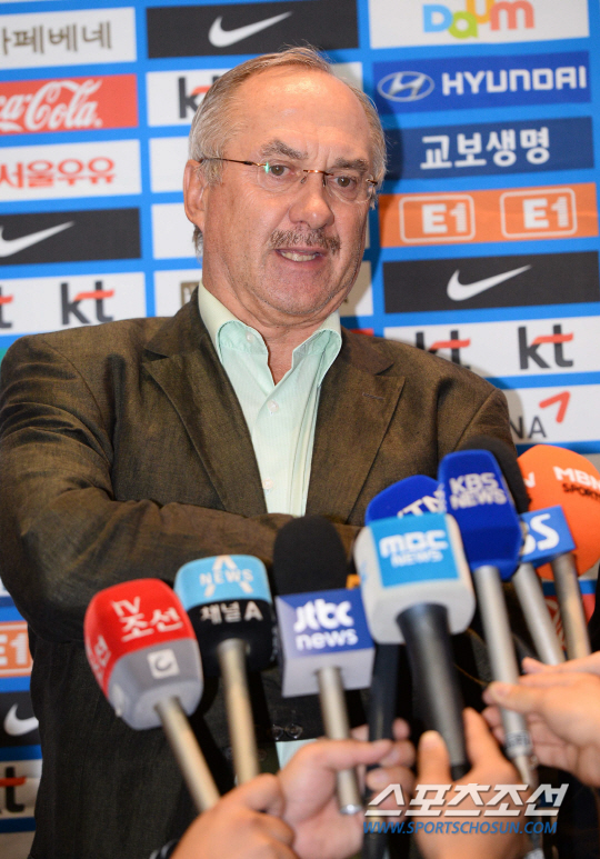 한국국가대표 축구대표팀 울리 슈틸리케 감독이 카를로스 아르모아 수석코치와 함께 24일 인천공항을 통해 입국해 기자회견을 하고있다. 슈틸리케 감독은 지난 8일 한국에 와 취임기자회견 후 한국-우루과이 평가전을 관전하고 신변정리를 위해 11일 마드리드로 떠났었다.
